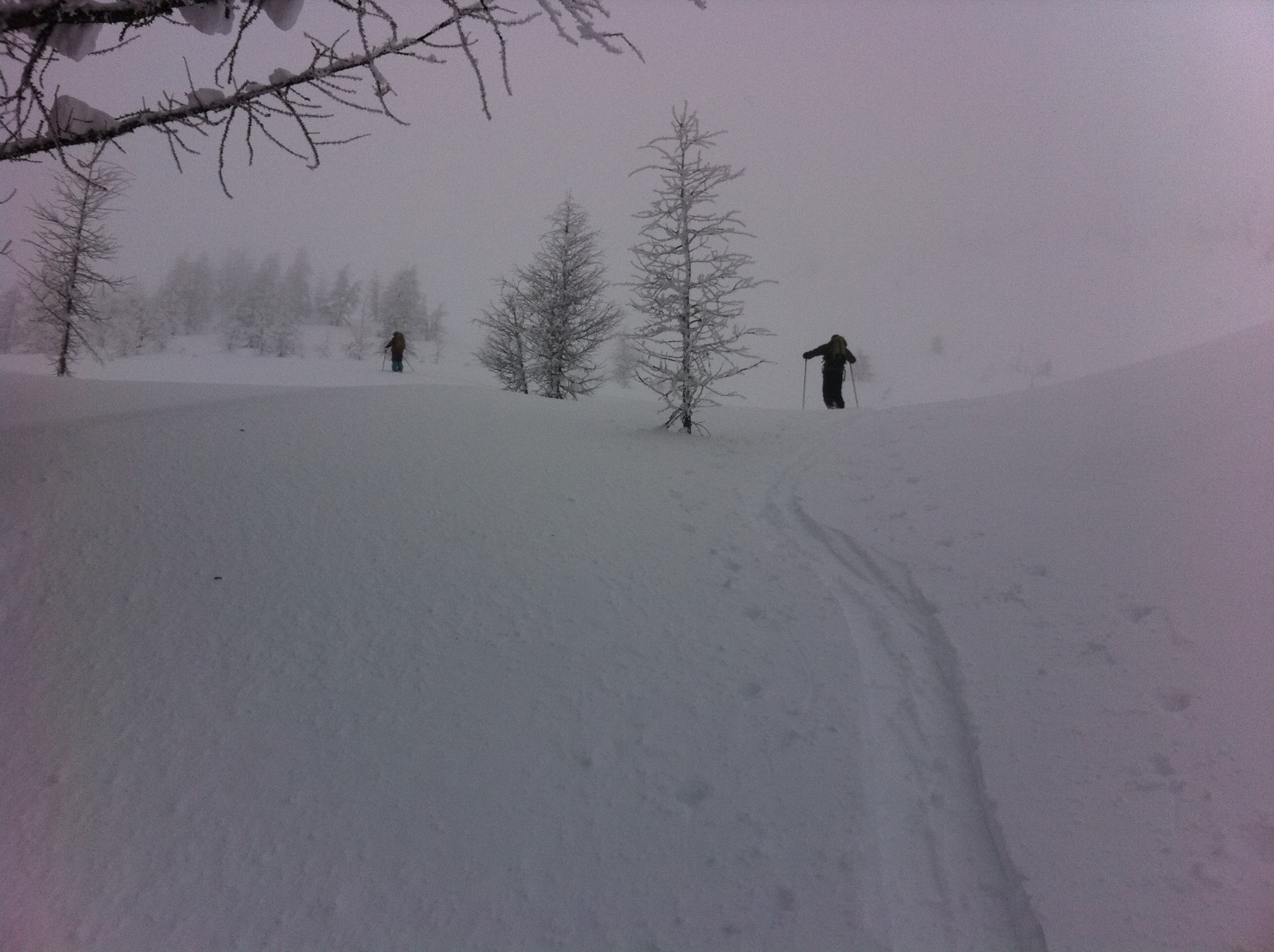 With limited visibility we were confined to the gladed tree runs, they did not disappoint. Beautiful steep gladed terrain, pillow lines, a few small drops. Very nice!
