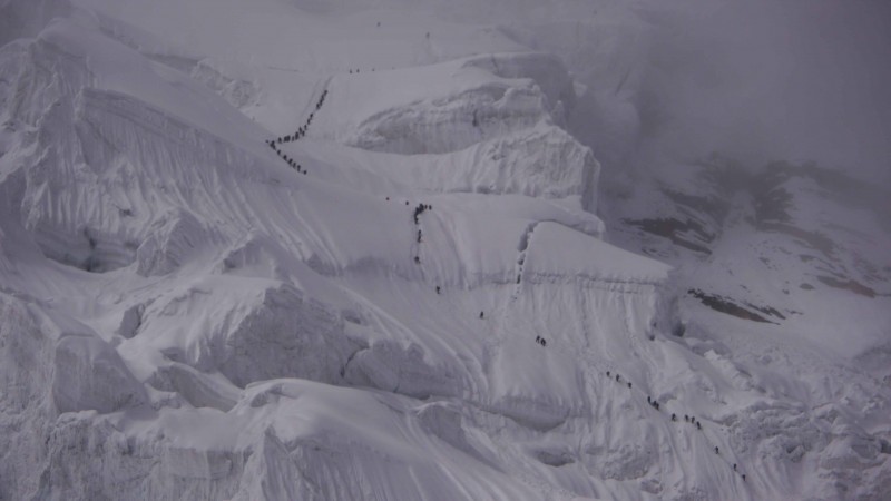 On our way up on Sept 22nd, we could see a line up of climbers on the fixed ropes, a traffic jam moving slowly through the seracs. Easily over a hundred people on their way up to Camp 2. We were coming late so we could avoid this and get up to our Camp 2.