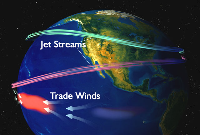 Image above: The image shows what happens when a very strong El Nino strikes surface waters in the Central equatorial Pacific Ocean. The sequence shows warm water anomalies (red) develop in the Central Pacific Ocean. Winds that normally blow in a westerly direction weaken allowing the easterly winds to push the warm water up against the South American Coast. Click on image to enlarge.