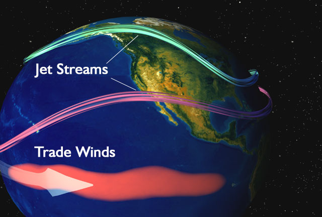 Image above: This image shows the current El Nino’s split personality. Warm waters develop in the central Pacific Ocean. In this case, the warm water anomalies tend to stay in place in the central Pacific.