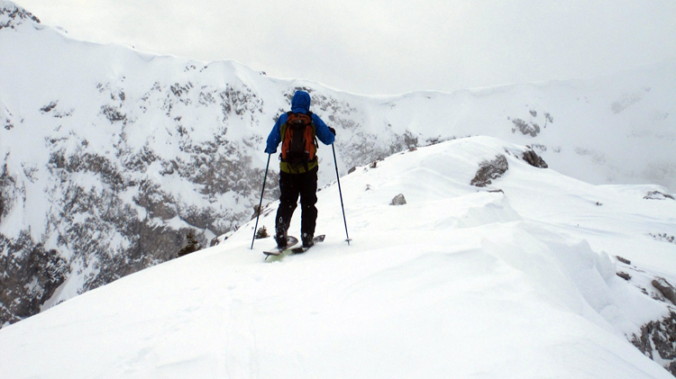 Our next touring attempt was trying short approach skis with climbing skins and on the decent, folded the skis into our packs. These worked better than snowshoes as they glided however the extra weight remained an issue making it difficult to rack up vertical.