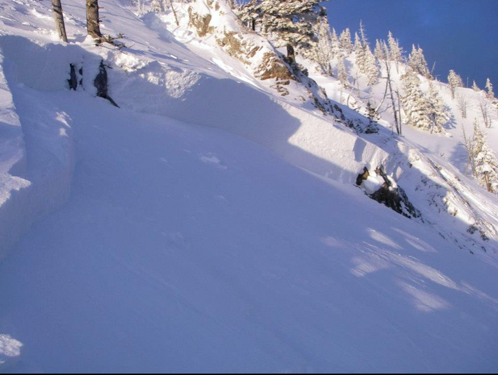 The avalanche in question stepped down from a small pocket of shallow (10 cm) wind slab that was triggered intentionally by a skier, to release a large (size 2.5) slab avalanche that was big enough to destroy several trees. The bed surface was one of two crusts present in the snowpack at that location, most likely the lower crust that formed at the beginning of November.