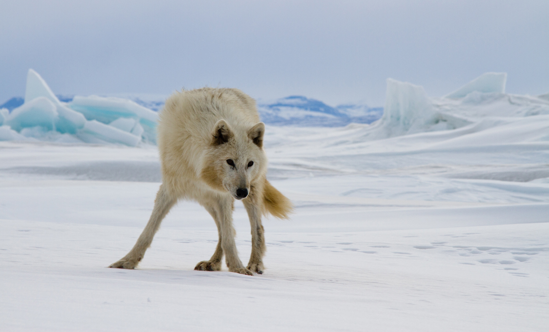 I believe that the Ellesmere wolf was a Spirit Wolf, welcoming us as we crossed 80o, from the High Arctic into the Polar Zone. And what was this wolf saying as it stared at us, head down, ears up, front legs spread out, highlighted by fractured ice and more distant mountains? To me, the communication was very clear. This was no Fairy Godmother Wolf. It was not granting us safe passage or promising what it could not promise. This was the Spirit Wolf, “Jon, Erik: Welcome. It’s harsh up here. You’re alone, far from your brothers and sisters; in a land where rescue is difficult or impossible. You’re vulnerable, about to be exhausted, cold, half starved, battered, strung out. You might die. Welcome. It’s good to see you.”