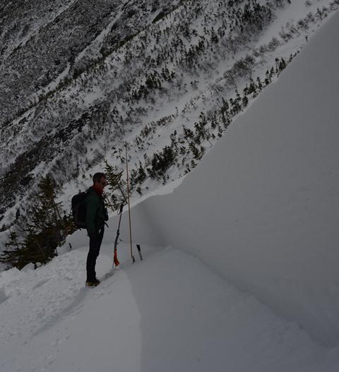 Over the last several years we have seen an increasing number of avalanche related close calls involving skiers and climbers. Between better equipment and getting out more during the midwinter avalanche season, incidents have been increasing. Of the different accidents that we routinely deal with, I believe avalanche accidents will slowly increase as part of our overall percentage of accidents on Mount Washington and may become the dominate player over time. As I started to put together a post describing Thursday’s avalanche incident in the Lower Snowfields it occurred to me it would be better to look at the big picture. (However all the photos are from this most recent incident.) I felt the need to do a Pit post to highlight the avalanche potential that you may encounter when climbing or skiing on Mount Washington under avalanche ratings in the middle of the danger scale, namely Moderate and Considerable. When snow stability falls into Low, High or Extreme it is generally pretty obvious, giving us either the green or red light for steep terrain travel. In between these more clear conditions is the middle ground, which of course is the most challenging for you, and us, to analyze. Stability tests with false stables, a little less or more new snow than forecasted, hidden sweet spots, and thin slabs leading into thicker slabs are just a few example that we need to pay attention to as we negotiate the terrain.
