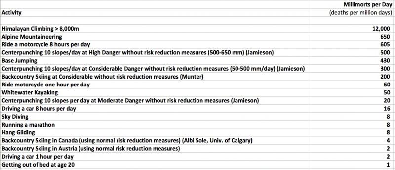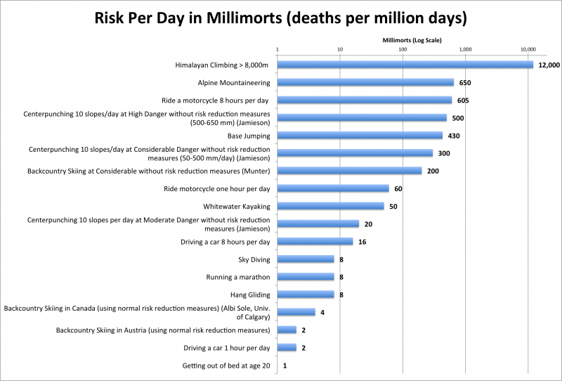 So what is the risk of recreating in avalanche terrain compared to other activities? The list below is in units of a “millimort”, which is one death in a million. I have converted all the numbers into millimorts per day so we can directly compare activities using consistent units. A Millimort is a convenient unit because one millimort is the chance of dying per day for an average 20-year-old from all causes.