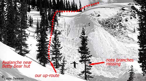 We are lounging in Betty Bear hut (Colorado’s 10th Mountain Hut System). We look south at an inviting ski slope. A little thing of perhaps 300 vertical feet, steep enough to avalanche but not an obvious slide path: no obvious demarcation such as the classic swaths you see cut into mountainsides worldwide.