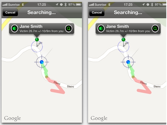 Smartphone avalanche search apps make use of various two‐way communication technologies including: cell network; WiFi; and Bluetooth. Additionally, two of the apps make use of GPS signals. Each app uses a slightly different set of technologies to communicate its location to another smartphone, which must also have the identical app installed. Table 1 lists the technologies the different apps make use of. When searching using WiFi or Bluetooth signals, a smartphone app permits searches in a similar way to an older‐style analogue avalanche transceiver. Signal strength may be displayed as a number (SnoWhere) or on a bar chart (Snøg), with an increase in signal strength indicating increasing proximity to the victim. Signal direction is poorly resolved, as smartphones only have one antenna (per communication technology), and the orientation of that antenna may not be known to the user.
