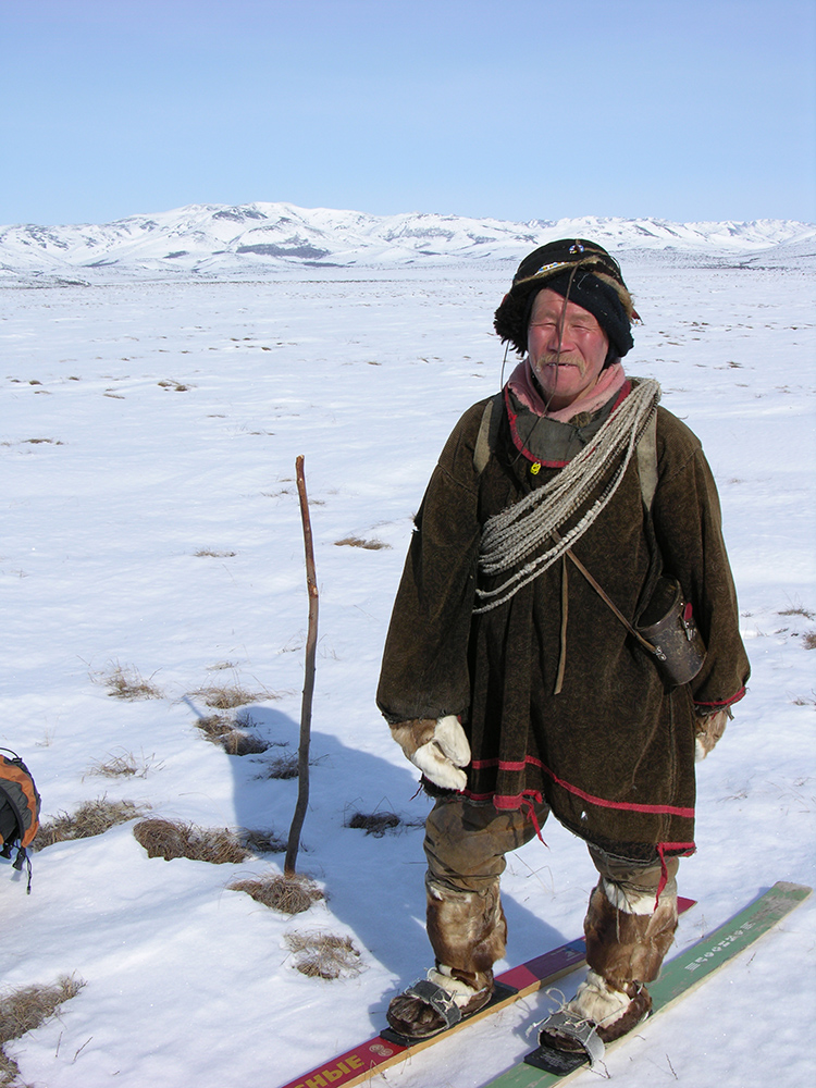 So on the skin track back up, I tried to remember, “What was life like, yesterday, before my new skis?” I guess I thought my life was okay then, but now I know that it was less than it could have been. Thinking about the past, I reflected on skiing in yesteryear. In 2004, my friend Misha and I were skiing across the Siberian tundra when we met a Koryak skier traveling from one reindeer camp to another. Caribou skin mukluks, two skis of different colors and different lengths, a strip of caribou skin for bindings, and a stick for a pole. He was pretty happy, but I wouldn’t trade places with him.