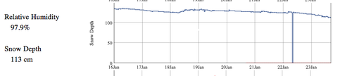 Maybe I am a bit of an optimist, but I do try to find the silver lining in most scenarios….no matter how bad. If you think longer-term (beyond this weekend lets say) then yes there will be a rain/melt-freeze crust that will be buried by subsequent snowfalls and may or may not be a problem (unfortunately I am leaning towards the ‘may’ column) in the future. But, you can also look at the recent warm temperatures as bit of a blessing in disguise. The warm temperatures and rain/heavy snow are causing the snowpack to settle rapidly. Take the screenshot below for example, this shows the snowpack settling at a consistent pace over the last week, where the snowpack went from 143cm (9 days ago) to 113cm today. A settled snowpack usually equates to a stronger, more mature snowpack. This will become the mid-pack or “building blocks” for the rest of the season and help bridge the weaker basal layers below.