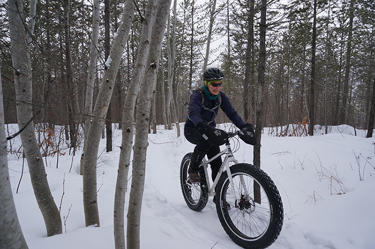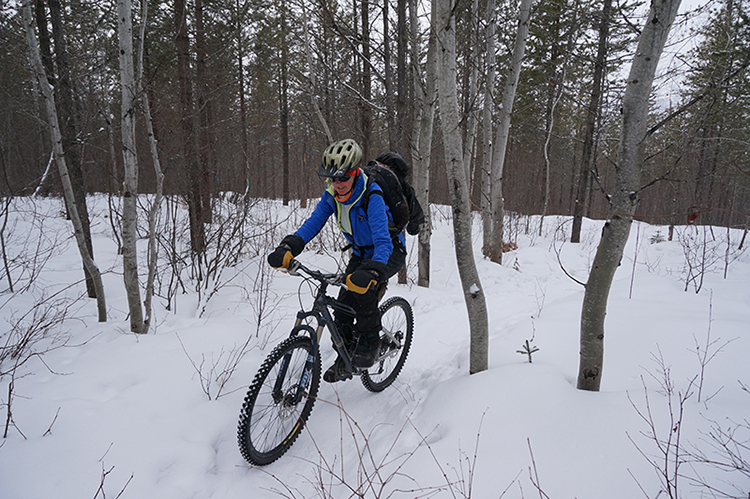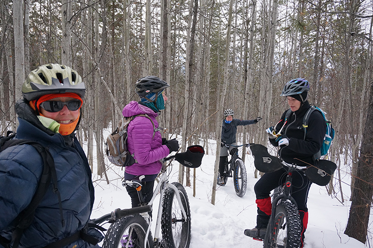 Here’s the sequence: When a big dump comes, and avalanche danger is extreme, we ski at Fernie Alpine Resort. When the resort gets tracked up, it’s off to the slack country. When we become comfortable with the stability, we jump on the sleds and go farther out, into the true backcountry. But meanwhile, back in town, the snow shoe folks, hikers, and dogs are out there packing the mountain bike trails for us. It works out just perfect. If new snow doesn’t fall, by the time the back country is getting scratchy, we come back to town, where there is still snow to slide on — or roll over. What difference does it make? The folks at Straight Line Ski and Bike Shop tell me that they can’t order snow bikes fast enough. With huge fat tires and running low air pressure, the bikes cruise and float through the forest. But, a traditional mountain bike with studded tires does the job well enough. Still lines to drop, turns to be had, trees to dodge, cold frosty air to breathe, and good cheer with our friends. And then the snow will fall and we can start at the beginning again.
