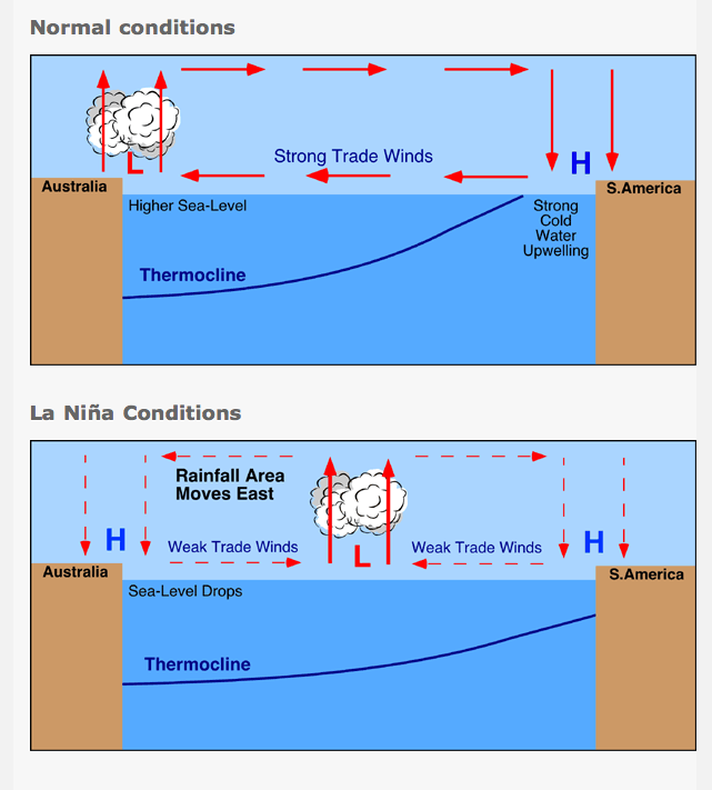 The increased amount of cooler water toward the coast of South America, causes increases in the deep cloud buildup towards southeast Asia, resulting in wetter than normal conditions over Indonesia during the northern hemisphere winter.
