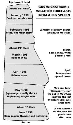 Gus divided the spleen into six areas, each representing 1 month. The top of the spleen (closest to the pig’s head) shows the current month. The bottom indicates the end of the upcoming six-month period. Where the spleen thickens, a change in the weather is indicated, usually pointing to a cold spell. Where there’s a pronounced bulge, expect even more inclement weather. Gus could even read wind and rain into the variations in the spleen.