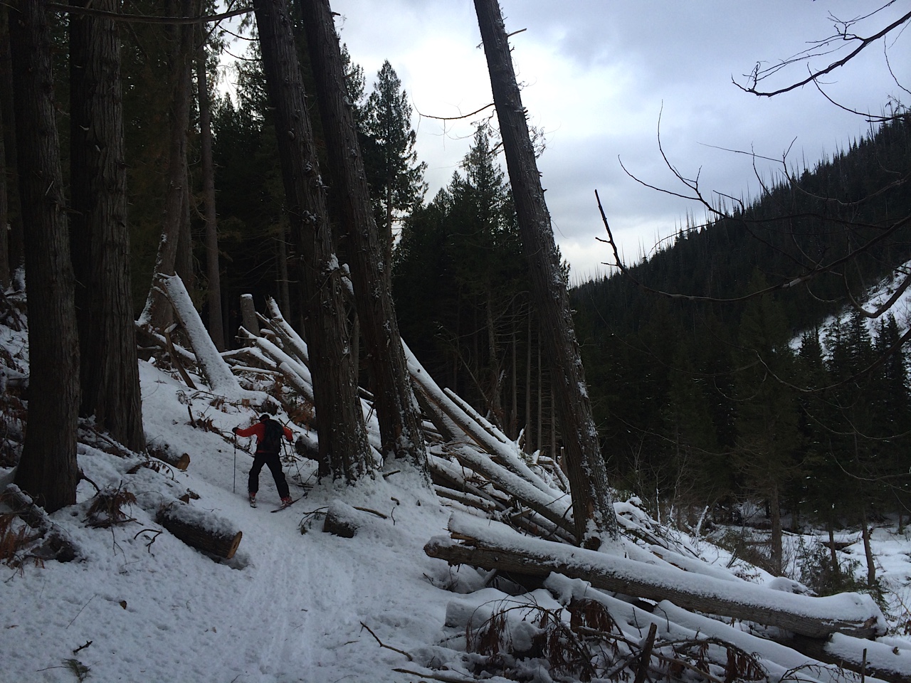 A large avalanche cycle in 2014 brough down a few 100+ year trees in the bottom of Cabin Bowl and serve as a reminder of an avalanches destructive potential.