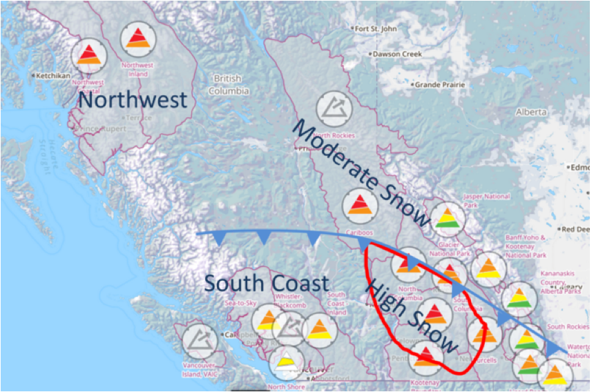 Let’s break things down into four different zones: High Snow Interior; Moderate Snow Interior; South Coast and Northwest. Obviously, that’s simplifying things a little bit, but it should help to illustrate the main factors affecting the evolution of avalanche danger across BC at this time. Have a look at the picture below: