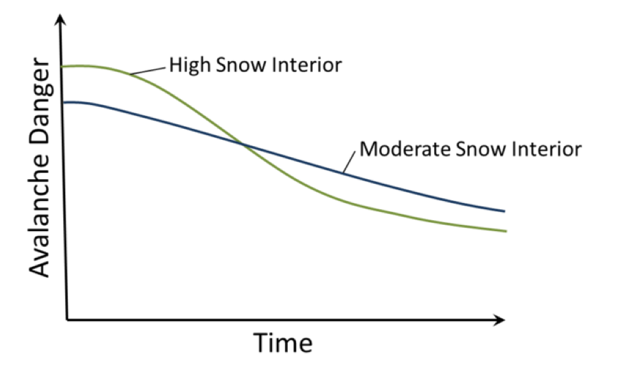 The figure below conceptually indicates what I’m trying to explain. Of course there are plenty of local factors like terrain, how prominent the mid-December weak layer was (which varies from valley to valley), the degree of wind slab formation and other factors that keep this a generalized idea at best. While this might help to explain a high level concept, please continue to read the bulletins and scrutinize the Mountain Information Network (the blue pins on the Avalanche Canada map) to get updated info and don’t rely on this graph (not that anyone would do that, right?!).