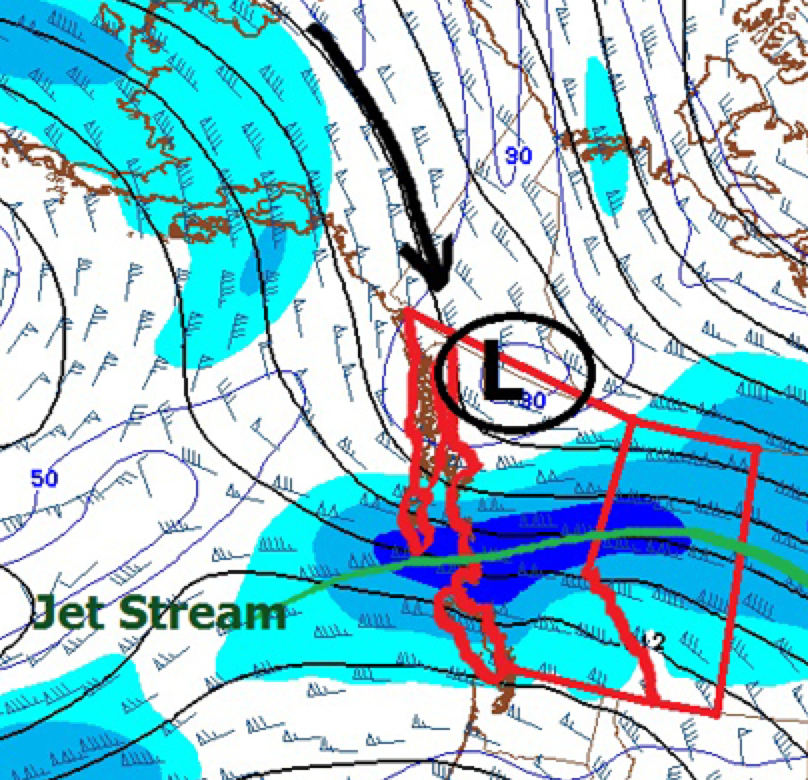 Around and after this time, around the 5th (March), more frequent storms start moving in across western Canada, with eastern Pacific (storm blocking) upper-level high pressure ridging not going away completely, but weakening more often with low pressure pushing through. The storm systems (depicted “L” in the illustration below), many times, will drop in as depicted, on a northwest flow.