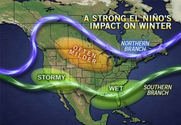 Above: A global depiction of a Strong El Niño with the split Jet Streams.
