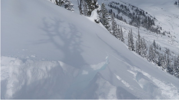 This view of an avalanche in the Teddy Bear Trees in Glacier National Park shows recent storm snow, sunny weather and a soft slab with shooting cracks.
