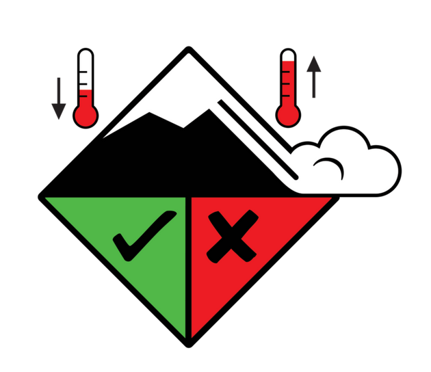 This icon is used when melt-freeze conditions are prevalent in a region. In melt-freeze conditions, danger is relatively low when surface snow is well frozen and a thick (generally at least 10-15cm) crust at or near the surface “cap” the snowpack. When temperatures rise and this crust breaks down, danger increases. This cycle is usually diurnal with lesser danger late at night and in the morning followed by greater danger in the afternoon and evening. Generally, once a region is considered to be in a melt-freeze state, the spring conditions icon will stay in place for the remainder of the season. However, if the weather changes back to more winter-like conditions we may go back to the normal winter danger ratings until things warm up and we return to spring conditions again.