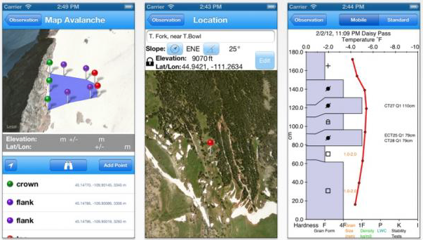 You see an avalanche, you ski over to the crown and pull out your iPhone. You snap a photo, measure the slope angle and aspect, then record a crown profile, all on your phone. As you ski down the path, you use your phone as GPS to map the slide. When you get to the toe of the slide you send a diagram of the crown and a map of the slide to your colleagues back at the office, then you post it to the Avalanche Lab network to alert everyone else. With Avalanche Lab you can do all that and more.