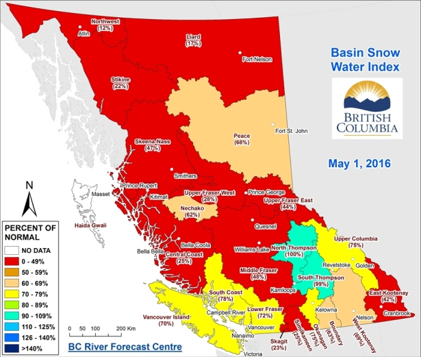 Some areas of BC are faring better than others, here is the snowpack data as of May 1st.