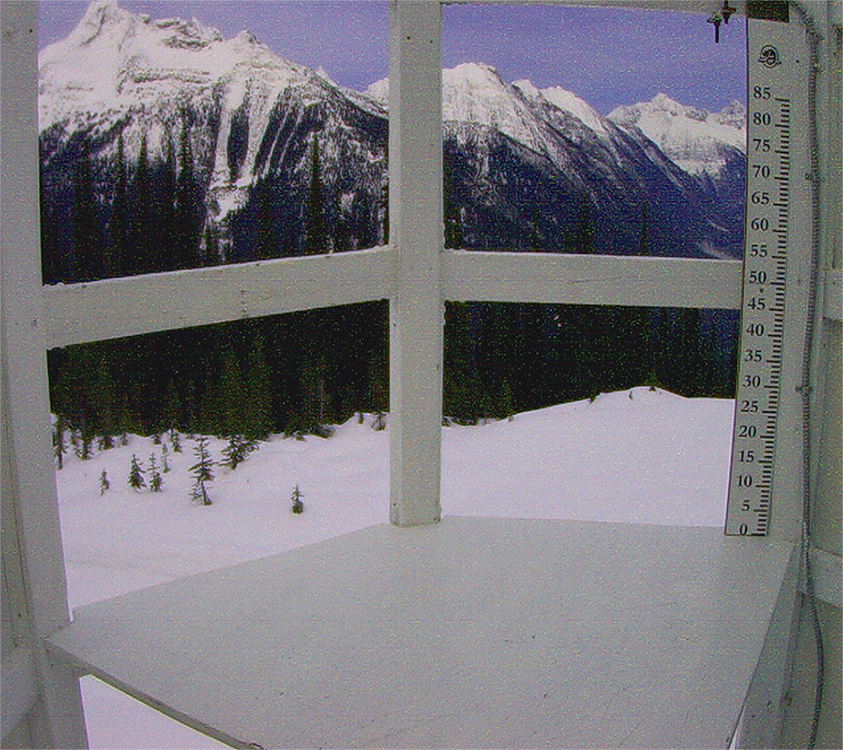 The next weather cam image displays daily snowfall accumulation at 1910 meters in the west end of Glacier National Park. Parks Canada Avalanche Technicians clear the snowboard mid-morning most days. A snowboard, also known as a Weaverboard is a meteorological tool used to aid in the obtaining of accurate measurement of snow accumulation. Click here for your live feed.