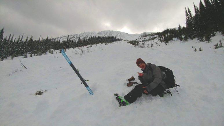 It was the day of the full moon March 12, 2017. Pete and I just got off the beaten track that was a staircase of a boot pack leading out of bounds from Kicking Horse Mountain Resort. From the top of T2 we could see our objective but ahead of us was a complex ridge walk to the next peak. The snow on the ridge was deep and there were cornice’s on either side. Once we finally summited T3 we had a good look down the face. From the top looking left there were some small chutes and pillows that extended into a bowl that ran down into the slide path. Looking fall line was the main chute about 300 metres long. It had a spine feature on the right that ended as the chute became tighter about half way down.