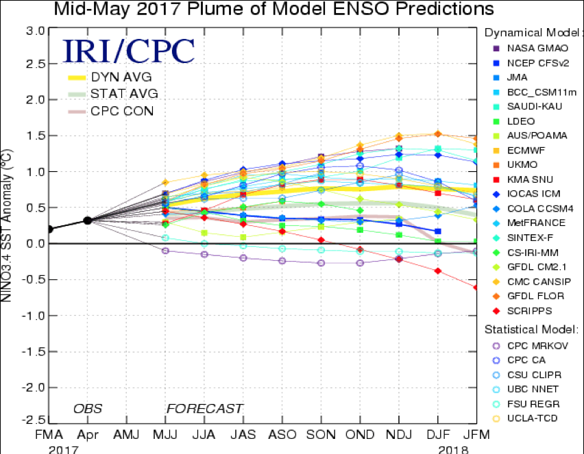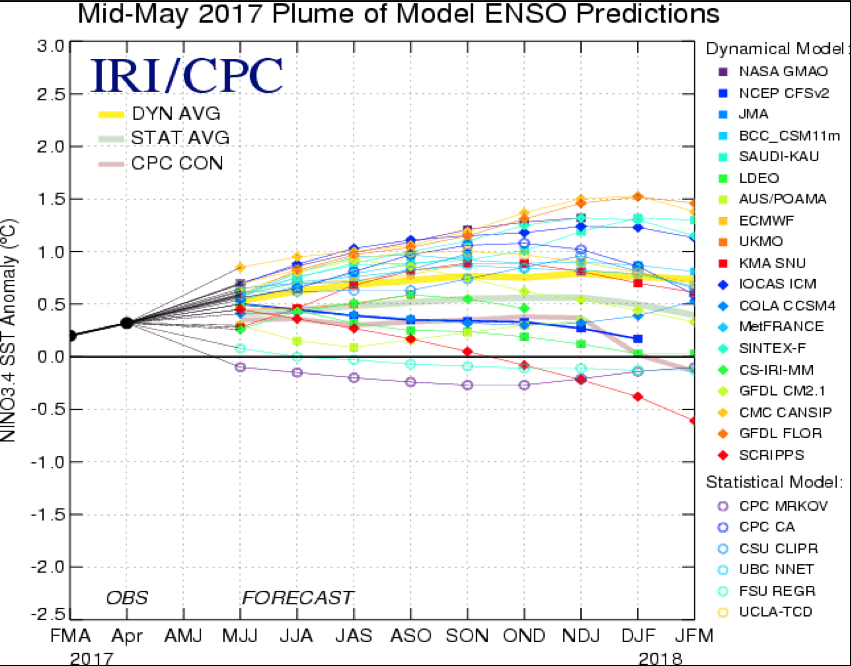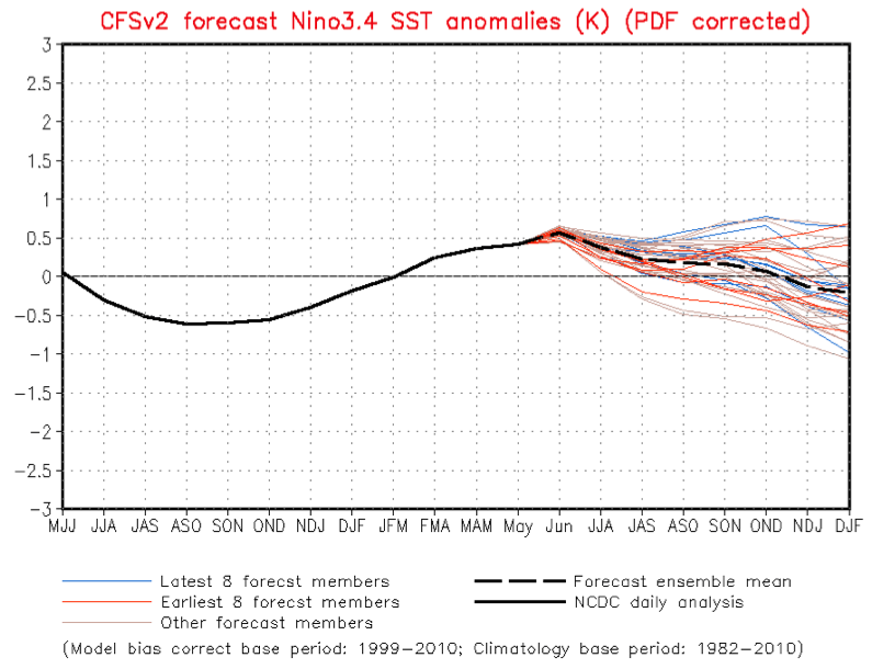 And the recent ensemble forecasts of the NOAA CFSv2 seasonal ocean/atmosphere model projects that conditions will cool towards Neutral conditions this fall.