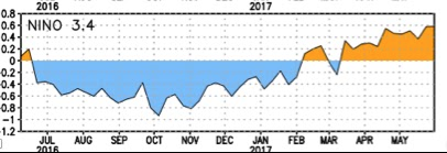 As you can see in the next figure, there were below-normal temperatures last fall (La Nina), which switched to warmer than normal conditions during the spring leaving us in marginal El Nino conditions.