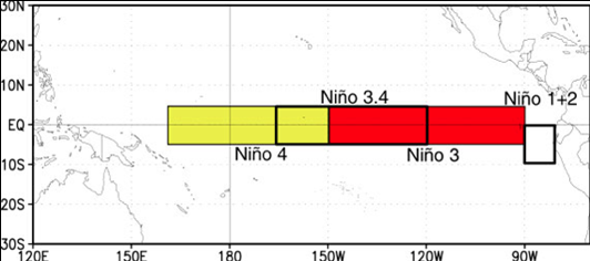The key parameter used to keep track of El Nino/La Nina is the sea surface temperature anomaly (difference from normal) in the central tropical Pacific (the Nino 3.4 region, see map). When sea surface temperatures are .5C or more warmer than normal in that region, we term it an El Nino, between .5C and -.5C Neutral, and when more the .5C colder than normal, La Nina.