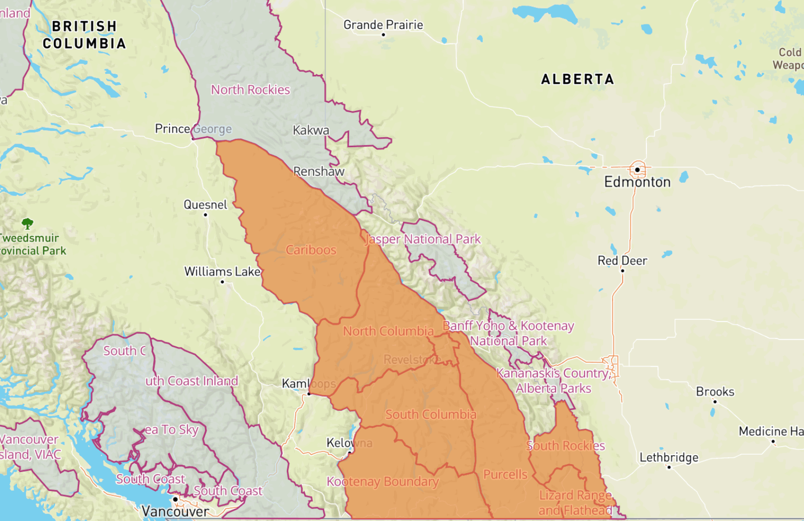Avalanche Canada and Parks Canada are issuing a Special Public Avalanche Warning for recreational backcountry users, in effect immediately until the end of day Monday, January 15. The warning applies to the following forecast regions: Lizard Range & Flathead, South Rockies, Purcells, Kootenay Boundary, South & North Columbia, Glacier National Park and the Cariboos. Following is a map of the regions involved: