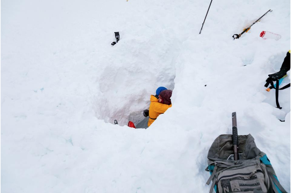 Our next priority was keeping her warm as we had been skinning uphill in our thinnest of base lawyers, I was able to get a toque on her and then we dug as quickly as possible to remove her pack.
