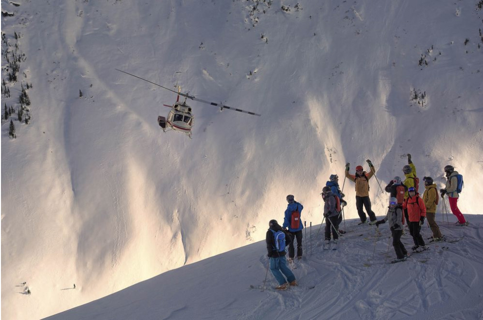 A Bell 212 helicopter flies by a CMH-led ski group.Photographer: Paul Morrison