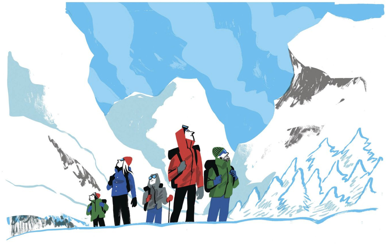 The morning we meet, Mosteller picks me up in Calgary, and we drive to a remote helipad near Spillimacheen, B.C., on the other side of Yoho National Park from Banff. We’re joined by a whole crew heading to take guided trips—an Australian social media executive named Ryan Hodgson; former pro baseball player Merv Rettenmund and his wife, Susan Clark; a Texas attorney with his family—and are picked up by a nine-person Bell 222 chopper. It thumps over soaring ridges and plunging valleys until we reach the base of the Bugaboos, an 11,000-foot-tall series of spires in the Canadian Rockies.
