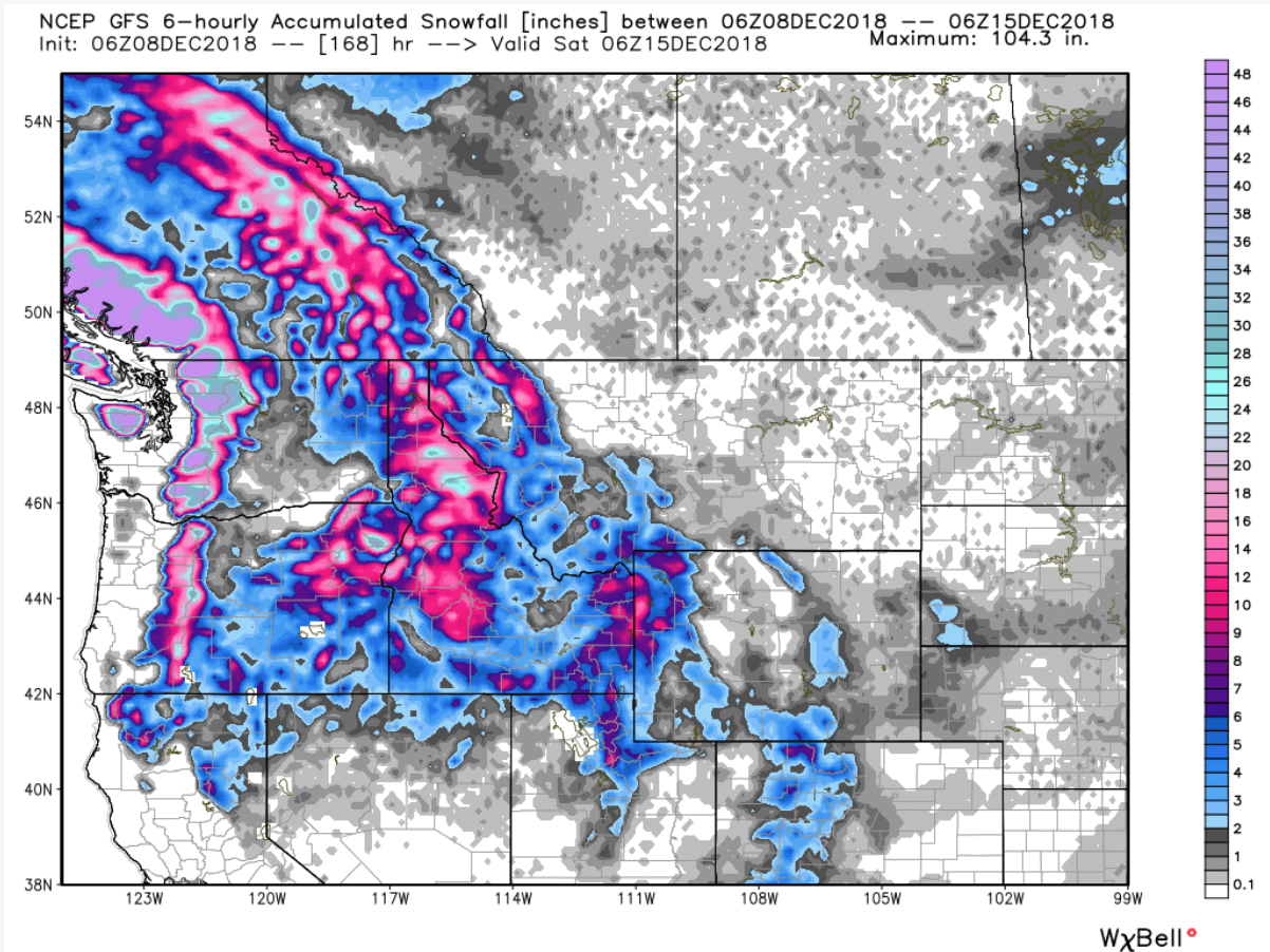 Below: Total Seven day snowfall for the west with 100 to 200 cms plus totals for many ski areas.