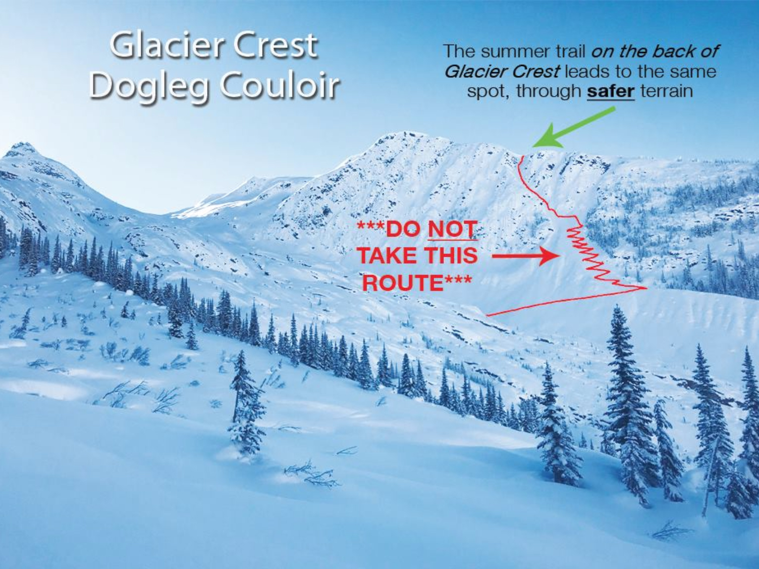 “Eyeing up that steep couloir in Rogers Pass? Before skiing it, ask yourself this: Is there a safer way of getting to the top other than straight up? Up-tracks and boot-packs straight up anything on the north side of Cheops, or up Frequent Flyer, or up the Dogleg Couloir on Glacier Crest, are extremely poor terrain choices and invite disaster. These gullies avalanche frequently – why take the risk if there’s a safer and easier way up?”