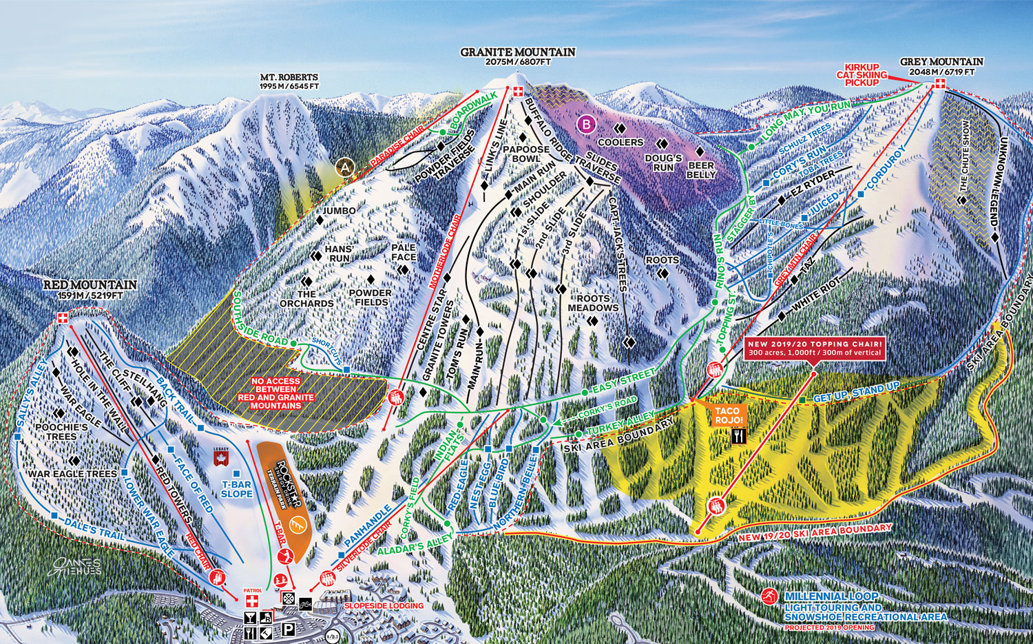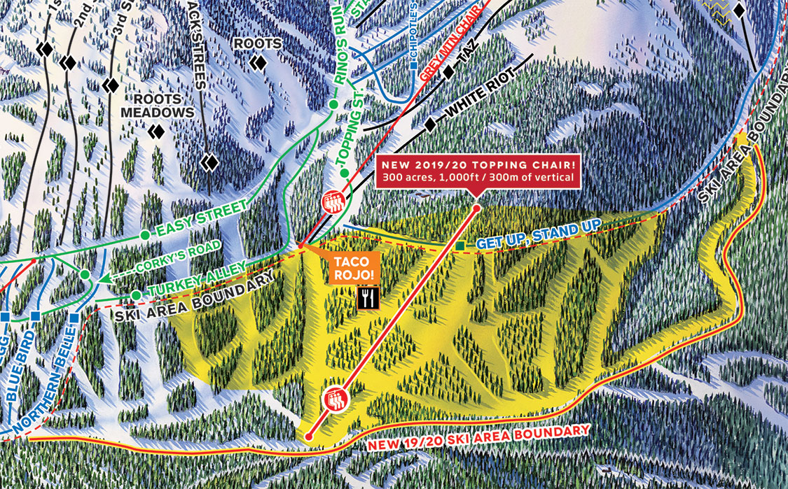 Indeed, Topping Chair makes “getting up to the good stuff” easier for everyone. Grey Mountain is now a straight-shot from the top of Silverlode with Topping’s addition, and should alleviate the occasional powder day bottleneck on Motherlode Chair. Skiers will be able to return to Topping from anywhere on Grey Mountain or from the legendary $10-a-run cat skiing on Mount Kirkup. (The big question is whether anyone’s legs can handle all that RED will throw at them!)