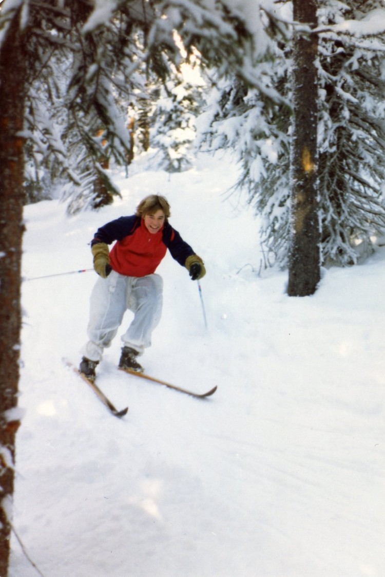 I can still hear Shauna’s giggles today in my mind’s ear as she and I made our way down the slopes of the Johnston Canyon trail. Daryl was ahead and I have little memory of him being there at all. I am sure he was nearby but perhaps he was ahead just enough to hear our laughter but was staying out of our way. Out of harm’s way. Rockies’ ski trails are really summer trails with snow on them. They are not designed for skiing. But that is what makes them fun. Narrow, fast, trees lining the edges, long steep sections with 90˚ curves at the bottom, bumps, roots, icy sections. The heli-skiing companies today make a big deal about teaching their guests how to ski in the trees by telling them to look for the open spaces and head for them. If Shauna and I had not employed this concept in the first 30 seconds on our own accord, I am certain we would have been maimed that day. The take-home message for me was that speed-is-good. I have lived it ever since. Whistling past the lodge-pole pines was exhilarating. Our only breaking mechanism was to fall. We did not know how to snow plough. Or stop. We fell, peeled out, crashed and bailed, sometimes narrowly missing the trees, or getting tangled in the Labrador tea bushes. Our red faces gleamed with delight as we picked ourselves up from fall after fall. We discovered another element to the landscape. Gravity. It seemed as though we were just becoming weary when the welcome sight of the parking lot and the frozen grey Rambler came into view. The mountain had shown us all a great time. I was hooked.